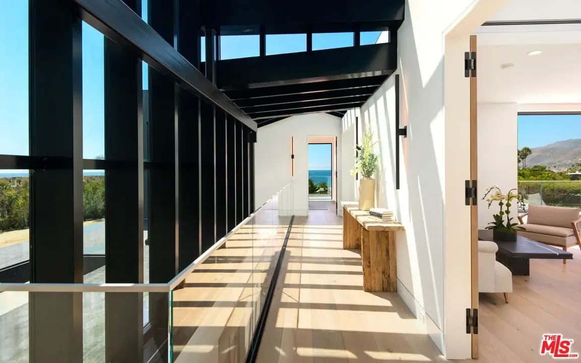 Also on the home's main floor are two en-suite bedrooms, one currently serving as a gym, plus an elegant powder room. On the upper level, there is a play area and family room, a laundry, and four ocean-view bedroom suites. Two of these are enormous owners' suites, with fireplace, seating area, walk-in closet, gorgeous spa-style bathrooms, and private decks. One features an atrium with a retractable star-gazer's skylight and the other is currently set up as a private office. Complete with three-zone air conditioning, a three-car garage with electric charger, and parking for a dozen guest vehicles, this new estate represents the pinnacle of contemporary Malibu living.